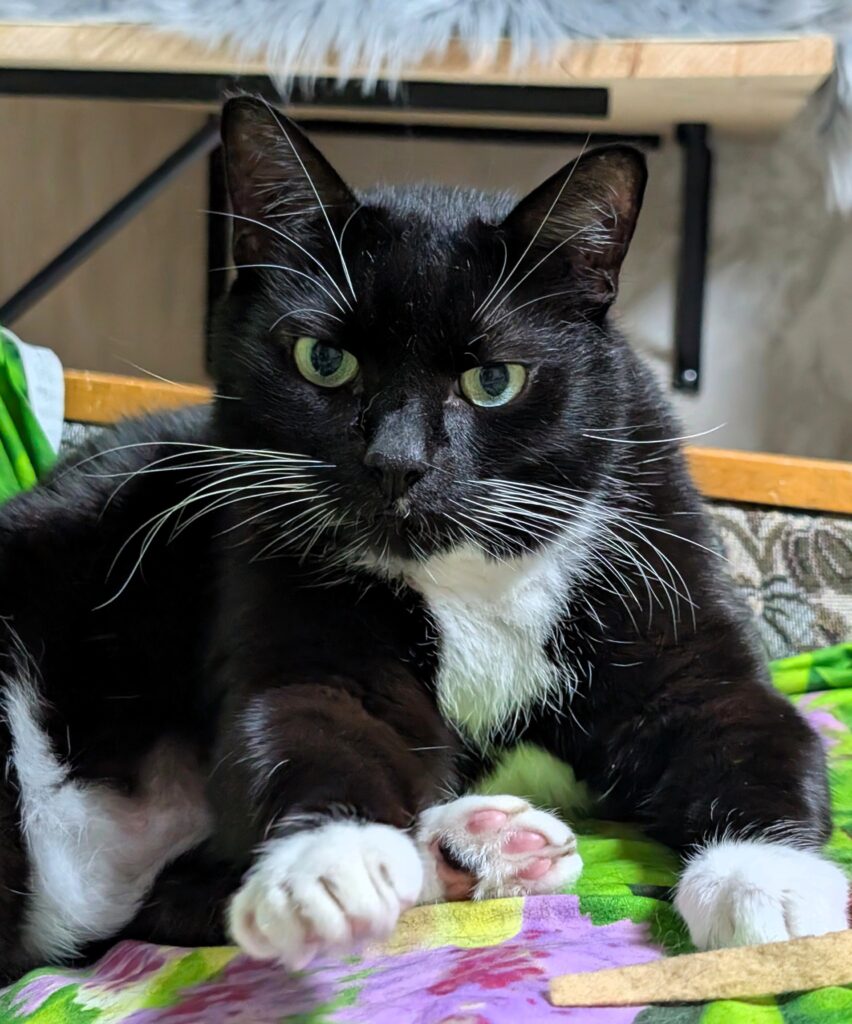 isane täiskasvanud must-valge lühikarvalineJorh on oma parimates aastates ülisõbralik kassipoiss, kelle kerge ümar vorm annab ainult lisavõlu.