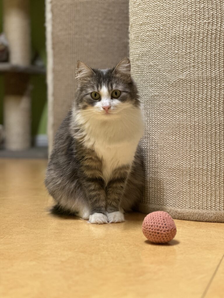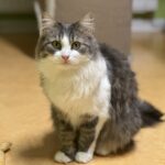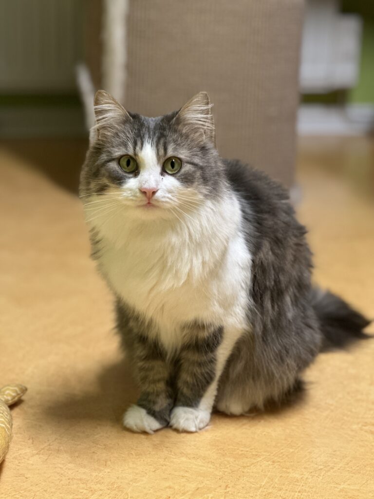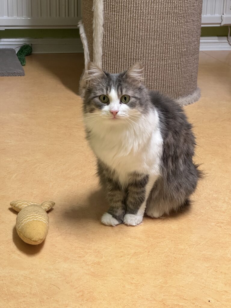 emane täiskasvanud hall-valge pikakarvalineHallivalge tüdruk Lenni leiti koos õdede-vendadega Kohtla-Järvelt tehaseterritooriumilt.