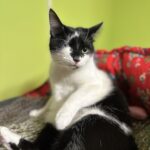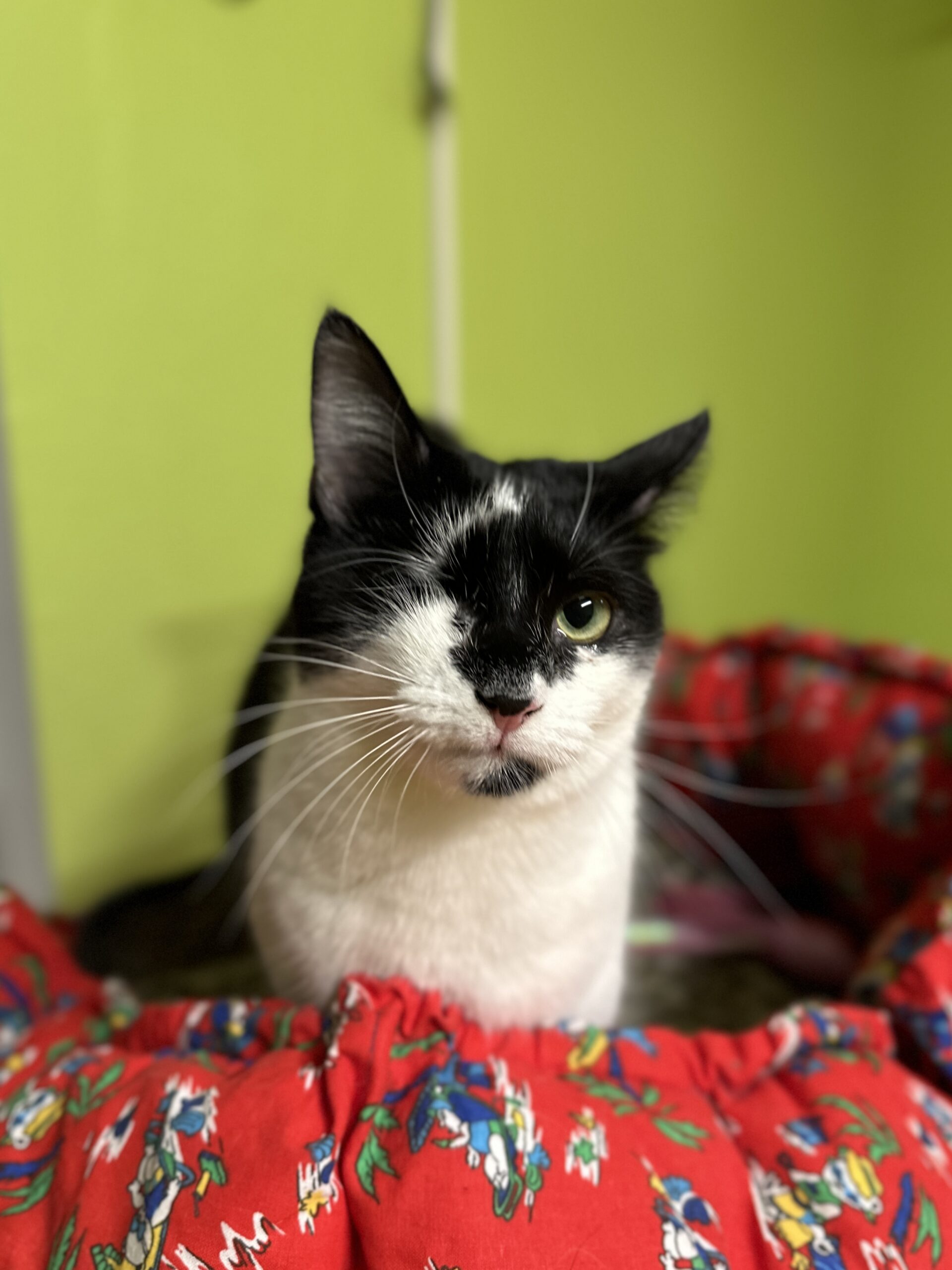 emane täiskasvanud must-valge lühikarvalineTip on päästetud Kukruse kolooniast, ta oli leides 2-kuune. Leides oli üks silm haige, mistõttu tuli see eemaldada. Tipi tunneb lõua all oleva musta laigu järgi ära.