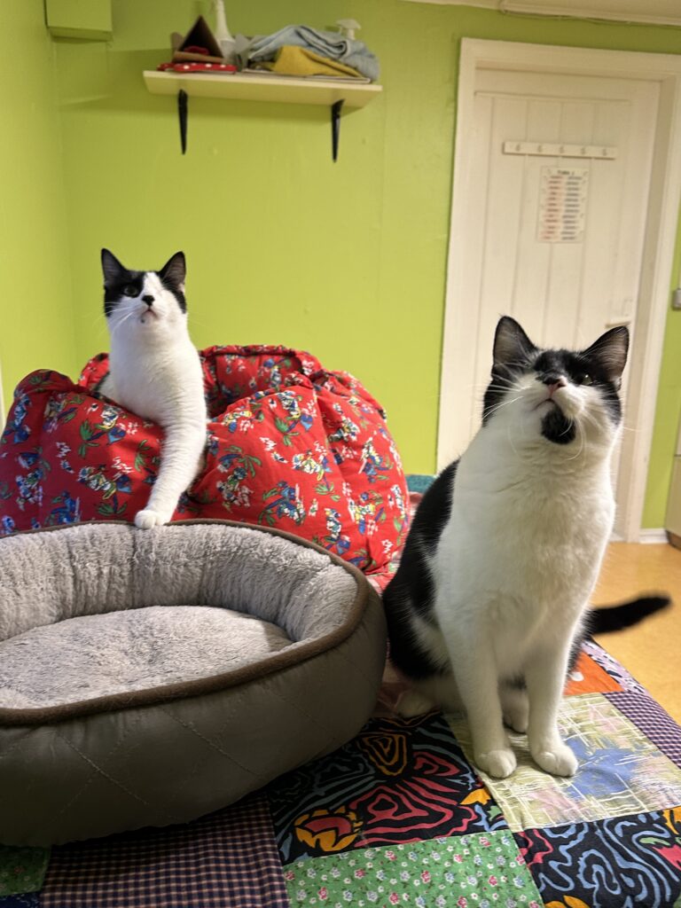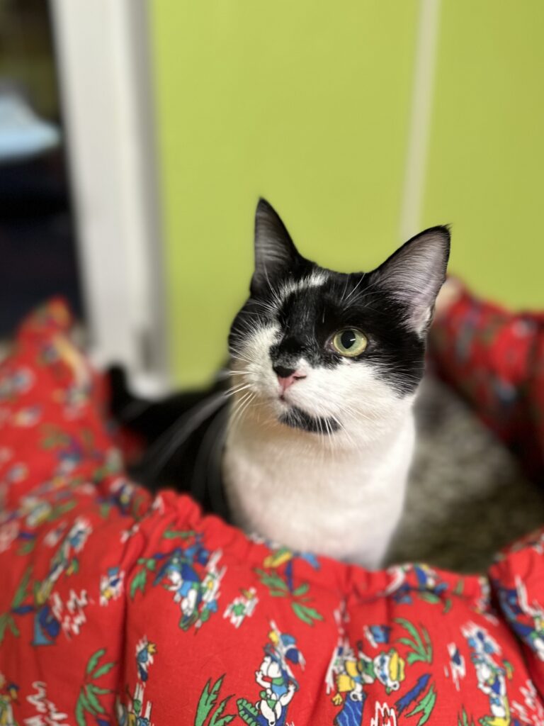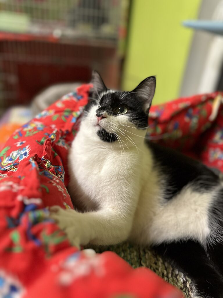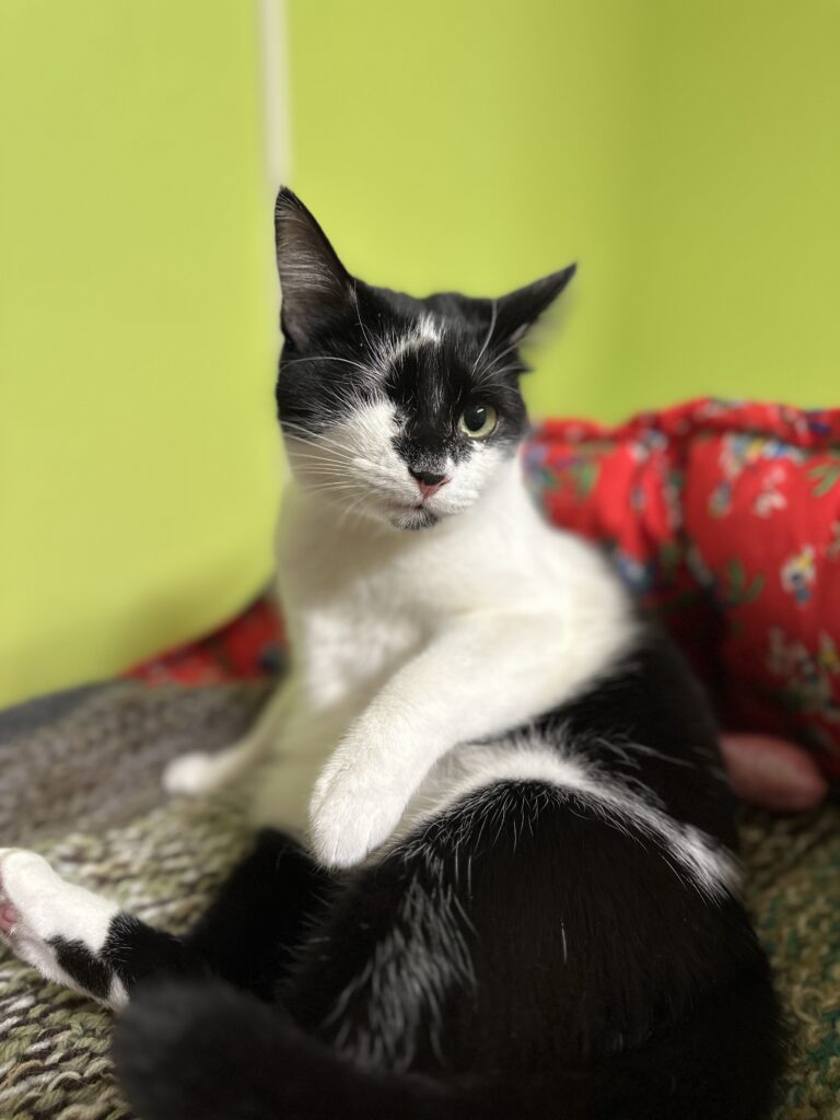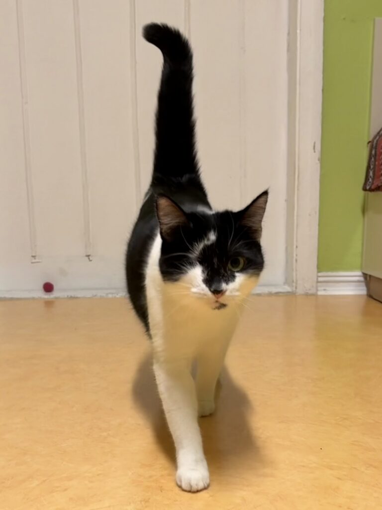 emane täiskasvanud must-valge lühikarvalineTip on päästetud Kukruse kolooniast, ta oli leides 2-kuune. Leides oli üks silm haige, mistõttu tuli see eemaldada. Tipi tunneb lõua all oleva musta laigu järgi ära.